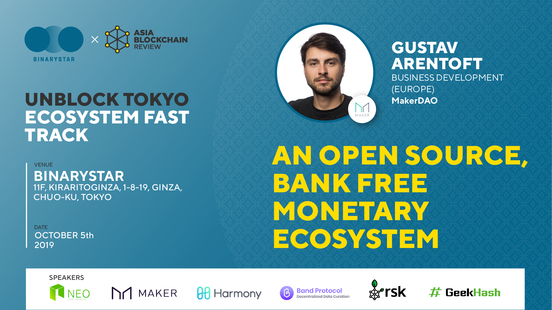 BINARYSTAR and Asia Blockchain Review are seizing this opportunity to discuss the possibilities offered by blockchain for Japan’s financial industry, particularly how DeFi could revolutionize the industry. Join us in October as we explore how we might be able to leave banks out of the equation during our flagship event, Unblock Tokyo. Among the talks to be held at Unblock Tokyo, Gustav Arentoft, Business Development Manager at MakerDAO — a decentralized and permissionless lending platform that allows users to borrow its USD-pegged stablecoin DAI — will be leading an eye-opening session on “An Open-Source, Bank-Free Monetary Ecosystem.”